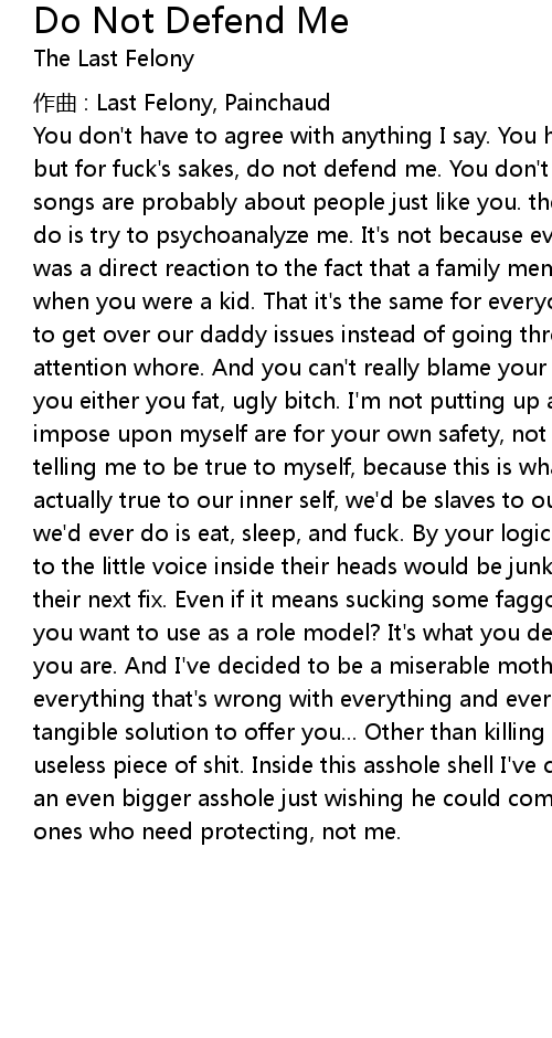 | You don' t have to agree with anything I say. You have every right to hate me, but for fuck' s sakes, do not defend me. You don' t know me. And most of these songs are probably about people just like you. the last thing you ever want to do is try to psychoanalyze me. It' s not because every action you ever committed was a direct reaction to the fact that a family member touched you ' down there' when you were a kid. That it' s the same for everyone. Some of us actually manage to get over our daddy issues instead of going through life as a pathetic attention whore. And you can' t really blame your father. I wouldn' t of hugged you either you fat, ugly bitch. I' m not putting up a front. And any limits I impose upon myself are for your own safety, not mine. Don' t waste your time telling me to be true to myself, because this is what I believe. And if we were actually true to our inner self, we' d be slaves to our animal instincts and all we' d ever do is eat, sleep, and fuck. By your logic, the people who listen most to the little voice inside their heads would be junkies living only to find their next fix. Even if it means sucking some faggot' s cock. Is that really who you want to use as a role model? It' s what you decide to do that establishes who you are. And I' ve decided to be a miserable motherfucker here to point out everything that' s wrong with everything and everyone. Even though I have no tangible solution to offer you... Other than killing yourself that is, you useless piece of shit. Inside this asshole shell I' ve created for protection, is an even bigger asshole just wishing he could come out and rape you. You' re the ones who need protecting, not me. |