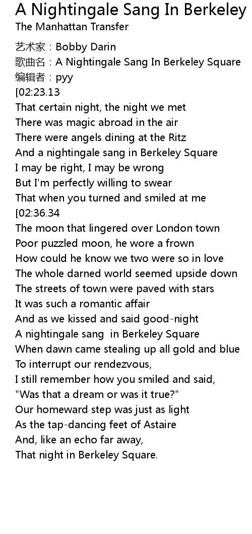 | [02:40.48][02:36.34][00:48.89] | A nightingale sang in Berkeley Square |