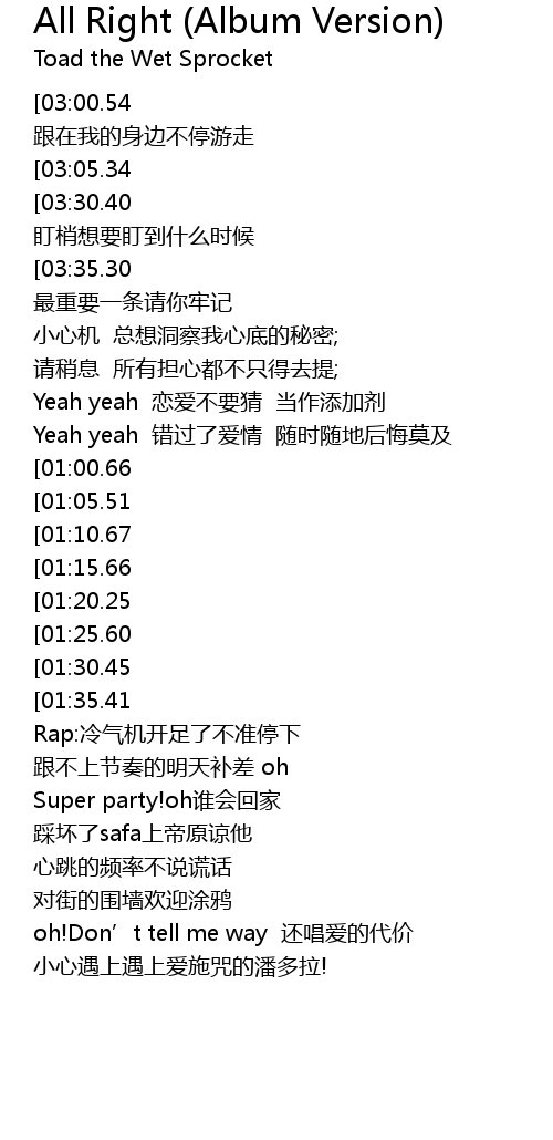 | [02:30.26][01:30.45] | all aright all right fan nao tong tong pao dao hou tai |