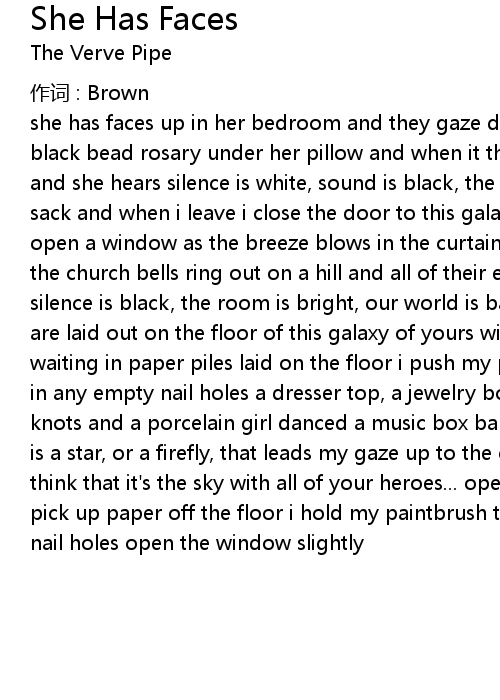 | she has faces up in her bedroom and they gaze down on her guarding her slumber a black bead rosary under her pillow and when it thunders she clutches it tightly and she hears silence is white, sound is black, the world is wrapped in a paper sack and when i leave i close the door to this galaxy of yours dropping by i open a window as the breeze blows in the curtains are butterflies and we hear the church bells ring out on a hill and all of their echoes left us singing silence is black, the room is bright, our world is basking in tv light and we are laid out on the floor of this galaxy of yours with all of your heroes waiting in paper piles laid on the floor i push my paintbrush lightly and fill in any empty nail holes a dresser top, a jewelry box, colored tassels tied in knots and a porcelain girl danced a music box ballet for us and your nightlight is a star, or a firefly, that leads my gaze up to the ceiling wondering if you think that it' s the sky with all of your heroes... open the window slightly, pick up paper off the floor i hold my paintbrush tightly, and fill in any empty nail holes open the window slightly |