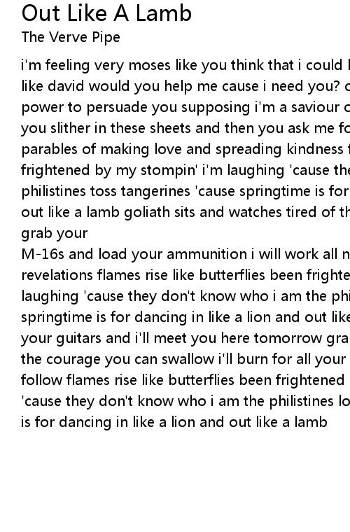 | M-16s and load your ammunition i will work all night rewrite the book of revelations flames rise like butterflies been frightened by my stompin' i'm laughing 'cause they don't know who i am the philistines toss tangerines 'cause springtime is for dancing in like a lion and out like a lamb now go and tune your guitars and i'll meet you here tomorrow grab that case of scotch it's all the courage you can swallow i'll burn for all your sins but i'm expecting you to follow flames rise like butterflies been frightened by my stompin' i'm laughing 'cause they don't know who i am the philistines load magazines 'cause springtime is for dancing in like a lion and out like a lamb |