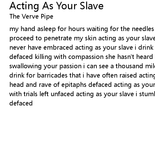 my hand asleep for hours waiting for the needles to begin i have no control they proceed to penetrate my skin acting as your slave i drink for amber waves i never have embraced acting as your slave i drink an open grave an epitaph defaced killing with compassion she hasn't heard a word that i have said swallowing your passion i can see a thousand miles ahead acting as your slave i drink for barricades that i have often raised acting as your slave i numb my head and rave of epitaphs defaced acting as your slave i drink while she forgave with trials left unfaced acting as your slave i stumble to her grave an epitaph defaced |