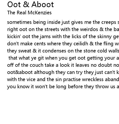 sometimes being inside just gives me the creeps so i jump in my boots & get right oot on the streets with the weirdos & the bars & the noise of the city kickin' oot the jams with the licks of the skinny getting up & oot to where they don't make cents where they ceilidh & the fling with their kilts on & everything they sweat & it condenses on the stone cold walls runnin' all down the make a swamp on the floor [Chorus:] that what ye git when you get oot getting your ass off of the couch take a look it leaves no doubt no good to sit&pout so go on get oot&aboot although they can try they just can't keep me in down there in hades with the vice and the sin practise wreckless abandon in the room starts to spin you know it won't be long before they throw us all outta here