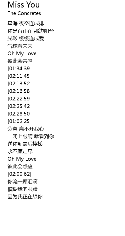 | [02:46.93][02:22.59][01:46.34][00:46.58] | Miss You Tonight |