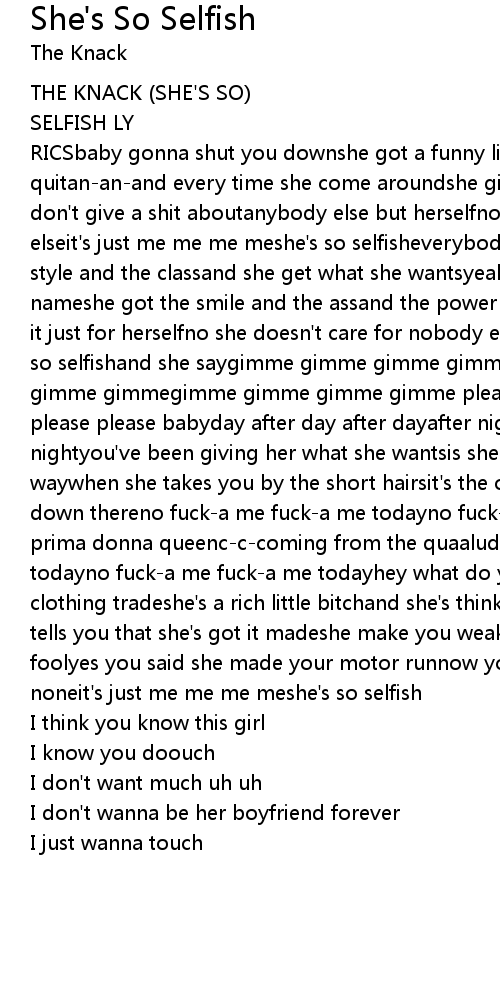 RICSbaby gonna shut you downshe got a funny little facebut her body don't quitan-an-and every time she come aroundshe give a wiggle and a winkbut she don't give a shit aboutanybody else but herselfno she doesn't care for nobody elseit's just me me me meshe's so selfisheverybody plays her gameshe got the style and the classand she get what she wantsyeah and everybody knows her nameshe got the smile and the assand the power to flaunt'cause she's really in it just for herselfno she doesn't care for nobody elseit's just me me me meshe's so selfishand she saygimme gimme gimme gimmegimme gimme gimme gimmegimme gimme gimme gimmegimme gimme gimme gimme pleaseoh won't you give it to me please please please babyday after day after dayafter night after night after nightyou've been giving her what she wantsis she giving you what you needno waywhen she takes you by the short hairsit's the only thing she'll leave you down thereno fuck-a me fuck-a me todayno fuck-a me fuck-a me todayshe's the prima donna queenc-c-coming from the quaalude sceneno fuck-a me fuck-a me todayno fuck-a me fuck-a me todayhey what do you sayshe's been working in the clothing tradeshe's a rich little bitchand she's thinking she's coolwhen she tells you that she's got it madeshe make you weak in the kneeslike a love sick foolyes you said she made your motor runnow you know she'll never give you noneit's just me me me meshe's so selfish