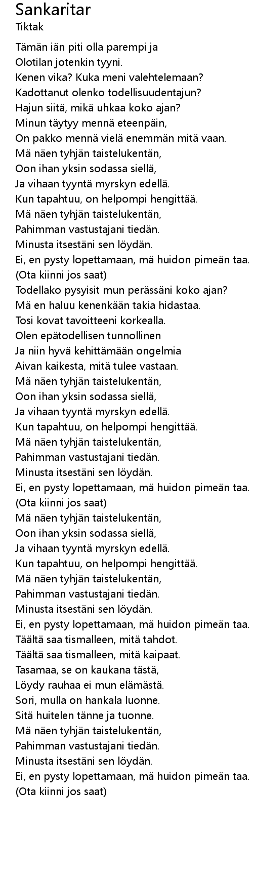 | Ei, en pysty lopettamaan, mä huidon pimeän taa. | |