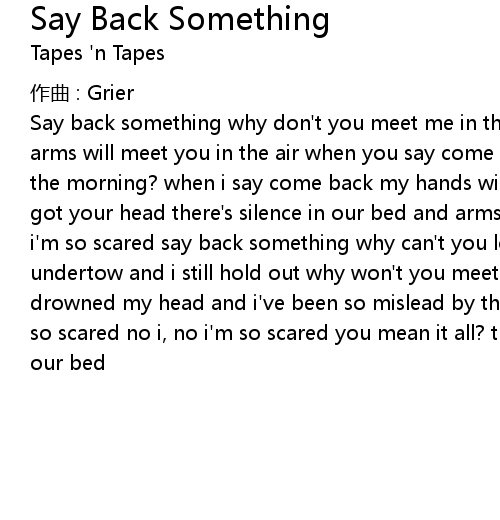 | Say back something why don' t you meet me in the morning? say back something my arms will meet you in the air when you say come back why don' t you mean it in the morning? when i say come back my hands will meet you in the air clouds have got your head there' s silence in our bed and arms and legs of lead and i, oh, i' m so scared say back something why can' t you look me in the eyes? stuck in the undertow and i still hold out why won' t you meet me in the morning? salt has drowned my head and i' ve been so mislead by the comfort of our bed and i, oh i' m so scared no i, no i' m so scared you mean it all? then say it all and i' ll be in our bed |