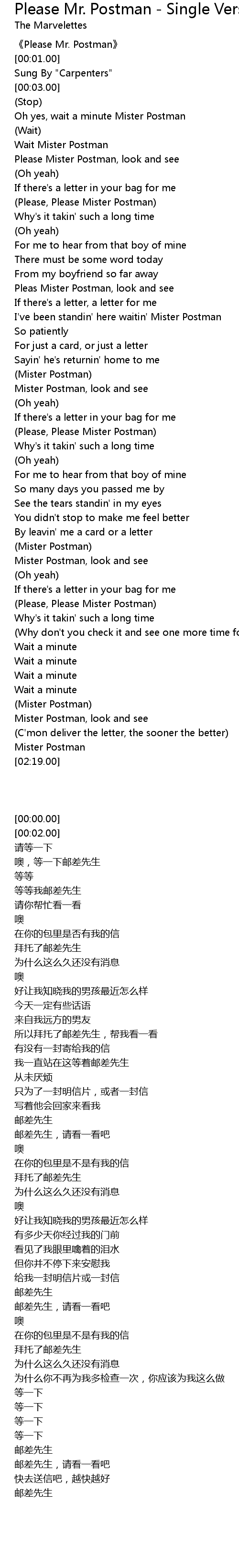 | [00:29.00] | Pleas Mister Postman, look and see |