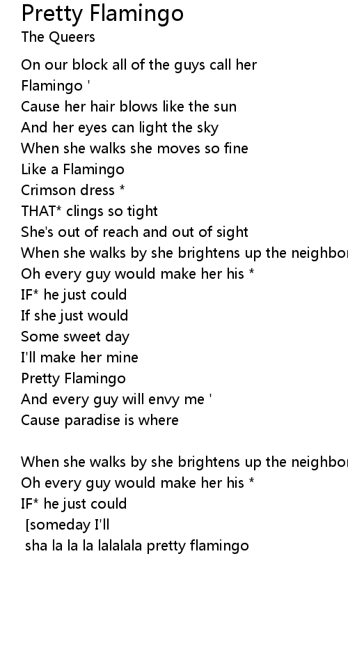If she just would.... sha la la la lalalala pretty flamingo [x2] [someday I'll make her mine] sha la la la lalalala pretty flamingo |