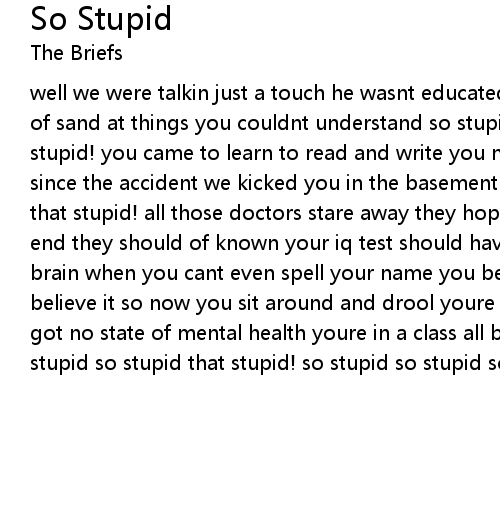well we were talkin just a touch he wasnt educated much you like to kick a lot of sand at things you couldnt understand so stupid so stupid so stupid that stupid! you came to learn to read and write you never had a chance in life ever since the accident we kicked you in the basement so stupid so stupid so stupid that stupid! all those doctors stare away they hope for an invinsable but in the end they should of known your iq test should have shown youre left without a brain when you cant even spell your name you better believe it you better believe it so now you sit around and drool youre in a corner on a stool youve got no state of mental health youre in a class all by yourself so stupid so stupid so stupid that stupid! so stupid so stupid so stupid that stupid! |