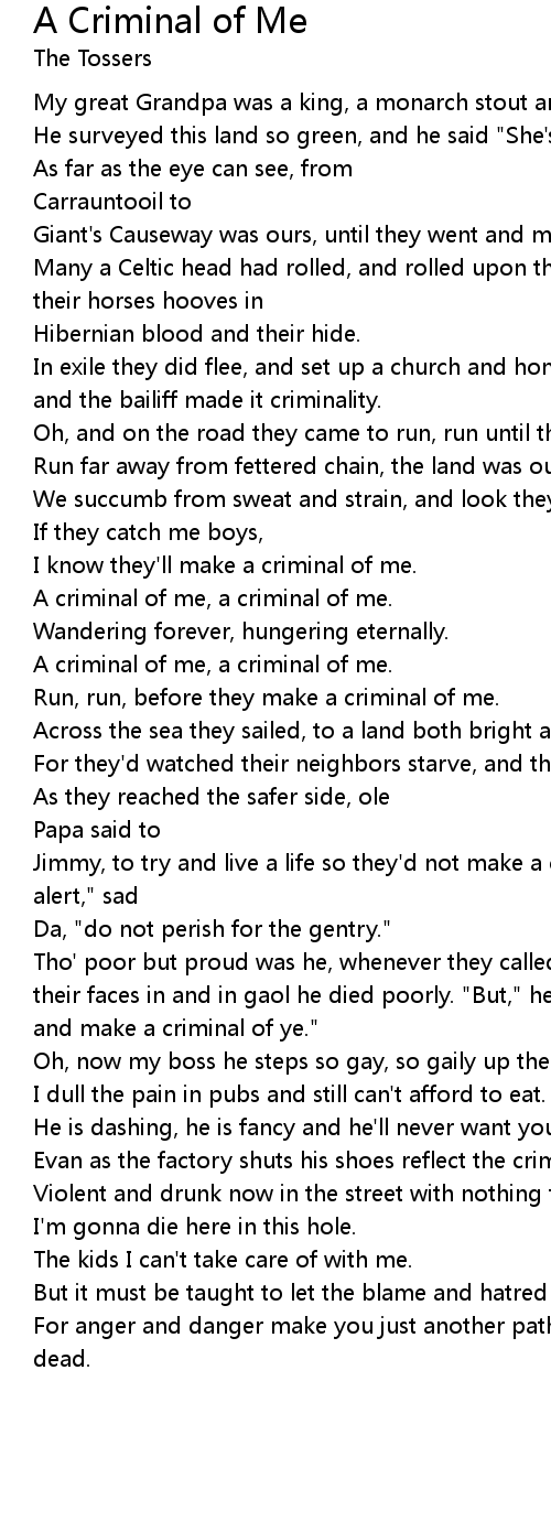 Tho' poor but proud was he, whenever they called discretely, well he'd smash their faces in and in gaol he died poorly. "But," he said, "don't let them try and make a criminal of ye." |