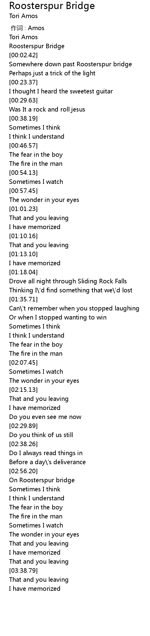 | [00:01.42] | Roosterspur Bridge |