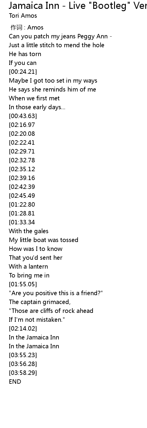 | [03:36.35][01:28.81] | In the Jamaica Inn |