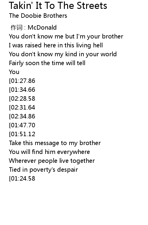 | [02:44.54][02:31.64][01:41.18][00:48.95] | Takin' it to the streets |