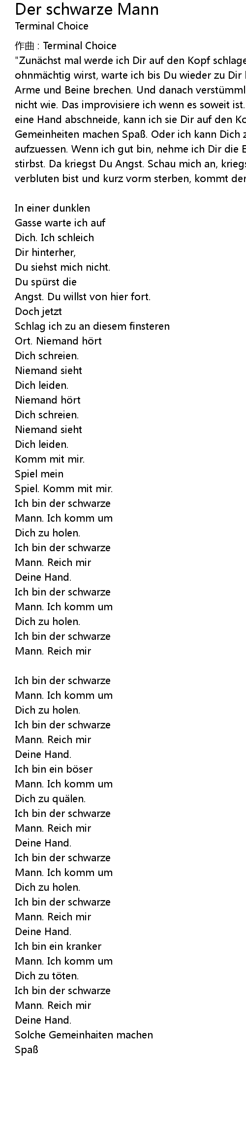 | " Zun chst mal werde ich Dir auf den Kopf schlagen. Eine Weile. Wenn Du ohnm chtig wirst, warte ich bis Du wieder zu Dir kommst. Dann werde ich Dir die Arme und Beine brechen. Und danach verstü mmle ich Dich. Aber ich wei noch nicht wie. Das improvisiere ich wenn es soweit ist. Wenn ich Dir beispielsweise eine Hand abschneide, kann ich sie Dir auf den Kopf drapieren. Solche Gemeinheiten machen Spa. Oder ich kann Dich zwingen Dein eigenes Ohr aufzuessen. Wenn ich gut bin, nehme ich Dir die Eingeweide heraus, ohne das Du stirbst. Da kriegst Du Angst. Schau mich an, kriegst Du Angst? Wenn Du am verbluten bist und kurz vorm sterben, kommt der Schu in den Mund. Dann zerstü ckle ich Dich und weg damit." Chorus | |