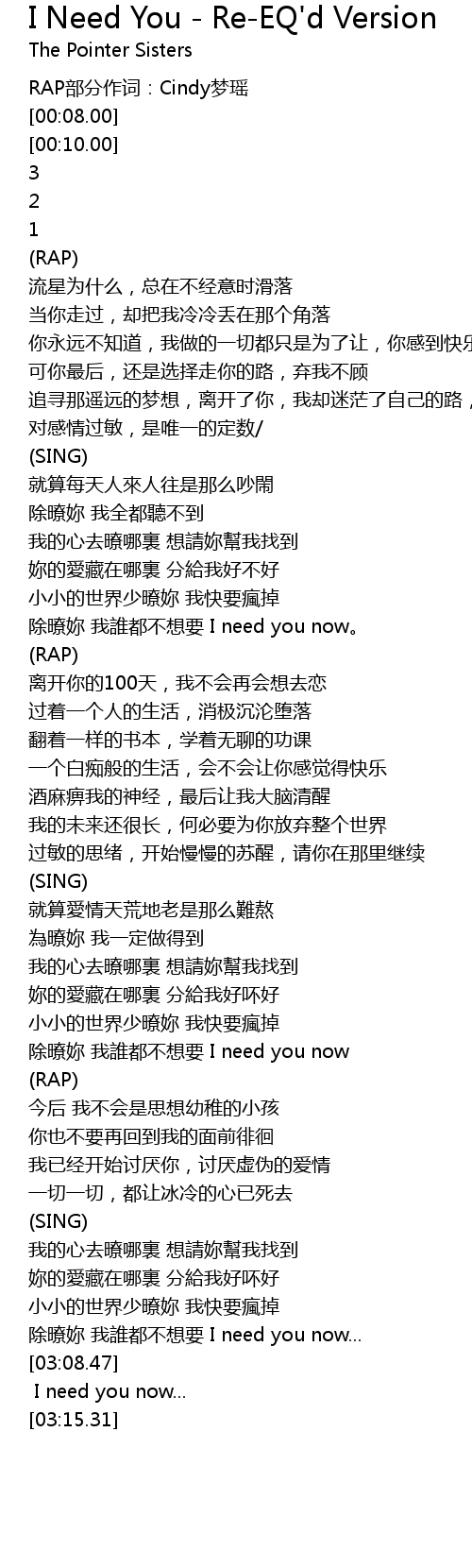 | [03:00.86] | 除暸妳 我誰都不想要 I need you now... |