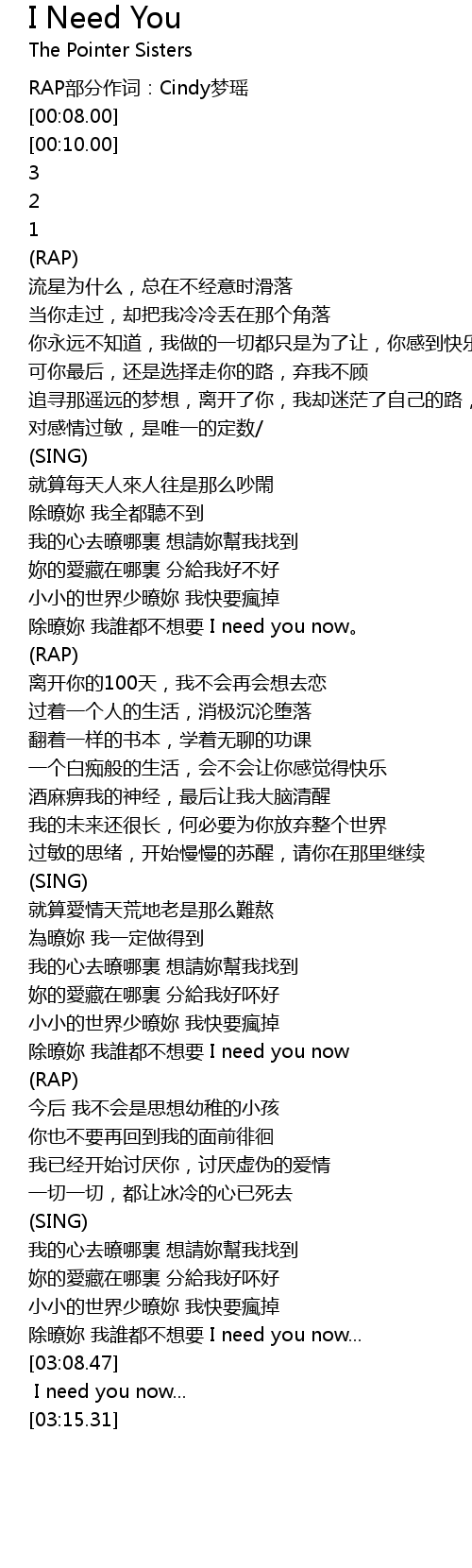| [03:00.86] | 除暸妳 我誰都不想要 I need you now... |
