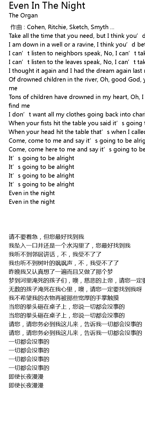 | [01:45.83] | Come, come here to me and say it’s going to be alright |