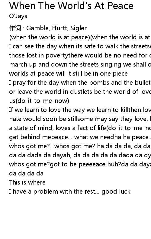| I can see the day when its safe to walk the streetswhen we learn to care for those lost in povertythere would be no need for our daughters and our sonsto march up and down the streets singing we shall overcome(do-it-to-me-now)when the worlds at peace will it still be in one piece | |