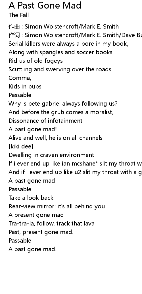 | 作词 : Simon Wolstencroft/Mark E. Smith/Dave Bush | |