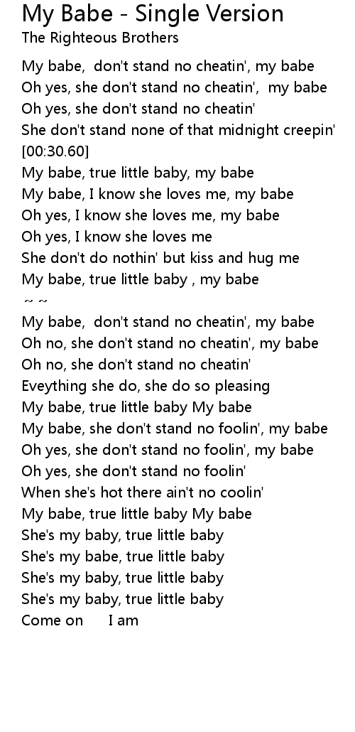 | [00:18.49] | Oh yes, she don' t stand no cheatin', my babe |