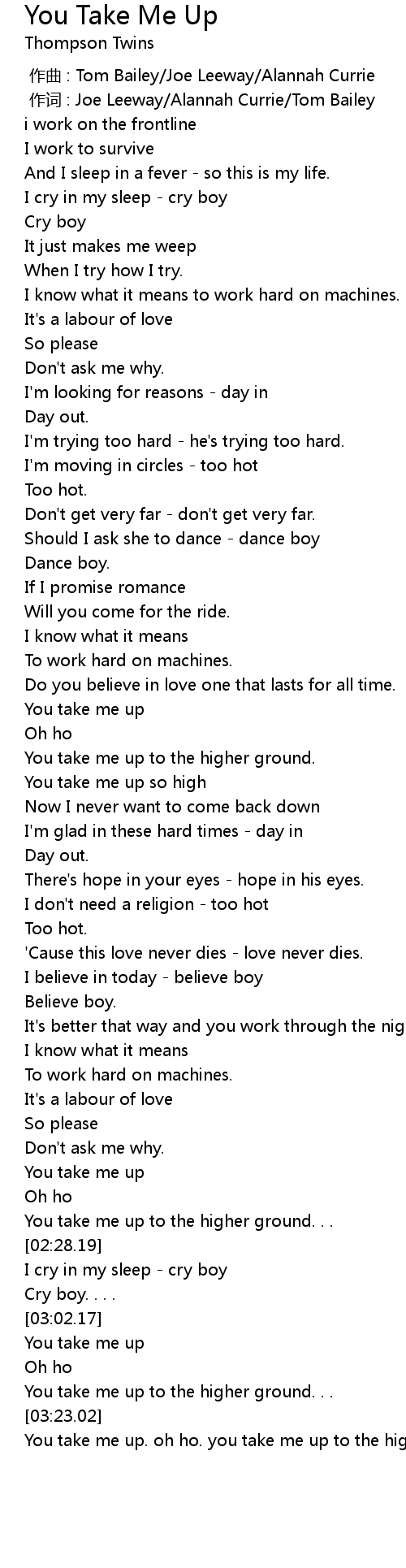 | [03:32.43] | You take me up. oh ho. you take me up to the higher ground. . . |