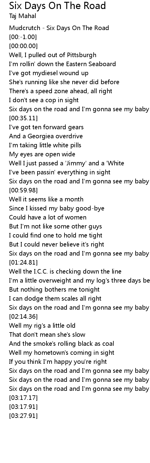 [03:06.61] Six days on the road and I'm gonna see my baby tonight