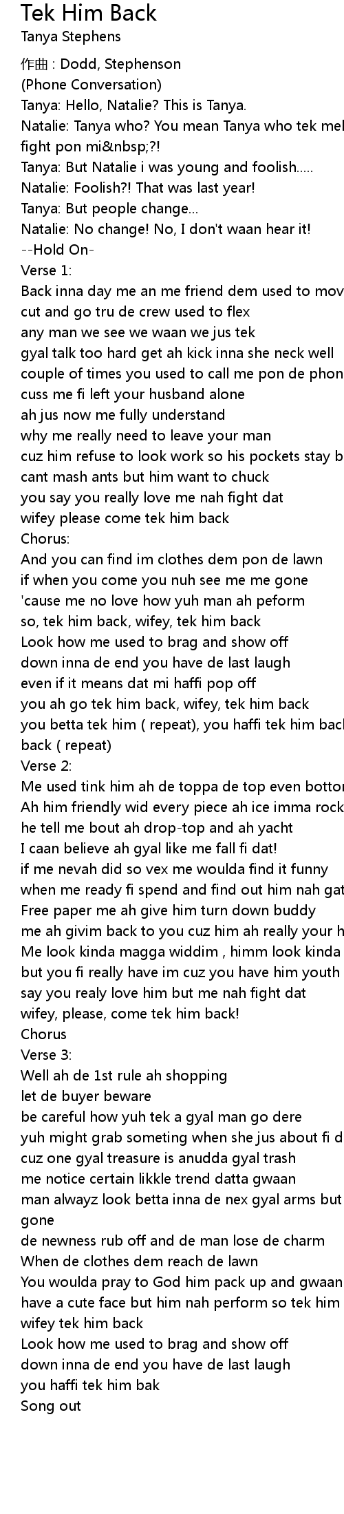 | you betta tek him ( repeat), you haffi tek him back (repeat), you betta tek him back ( repeat) | |