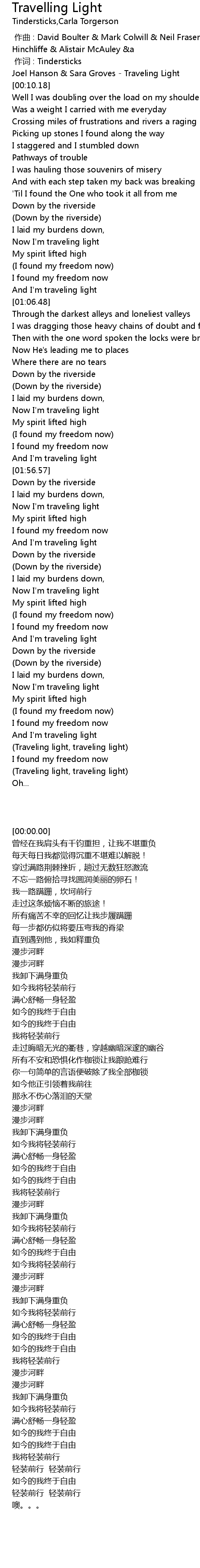| [00:00.00] | Joel Hanson & Sara Groves - Traveling Light |