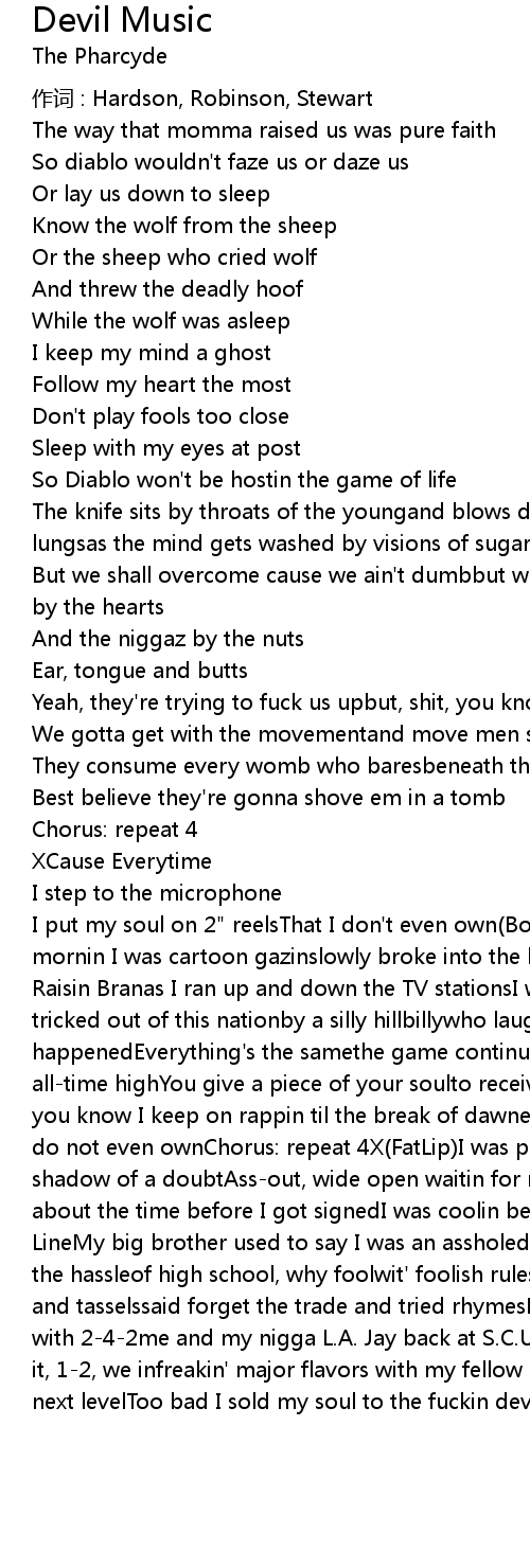 | I put my soul on 2" reelsThat I don't even own(Bootie Brown)Early Saturday mornin I was cartoon gazinslowly broke into the kitchento fill a bowl with some Raisin Branas I ran up and down the TV stationsI witnessed Indian Joegetting tricked out of this nationby a silly hillbillywho laughed as the shit happenedEverything's the samethe game continued into rappinDeception is at an all-time highYou give a piece of your soulto receive some crumbs from the pieBut you know I keep on rappin til the break of dawneven though it is my soul that I do not even ownChorus: repeat 4X(FatLip)I was po', nlack and brokebeyond a shadow of a doubtAss-out, wide open waitin for my shit to come on outSpeakin about the time before I got signedI was coolin behind Coolio in the County LineMy big brother used to say I was an assholedidn't graduate, couldn't handle the hassleof high school, why foolwit' foolish rules and guidelinesfuck the cap and tasselssaid forget the trade and tried rhymesHooked up with J-Swift, got with 2-4-2me and my nigga L.A. Jay back at S.C.U.I grab the MIC one-timeCheck it, 1-2, we infreakin' major flavors with my fellow NubiansTakin shit to the next levelToo bad I sold my soul to the fuckin devil |