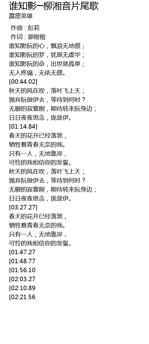 | [04:22.15][02:10.89] | 谁人知影孤女的心声。 |