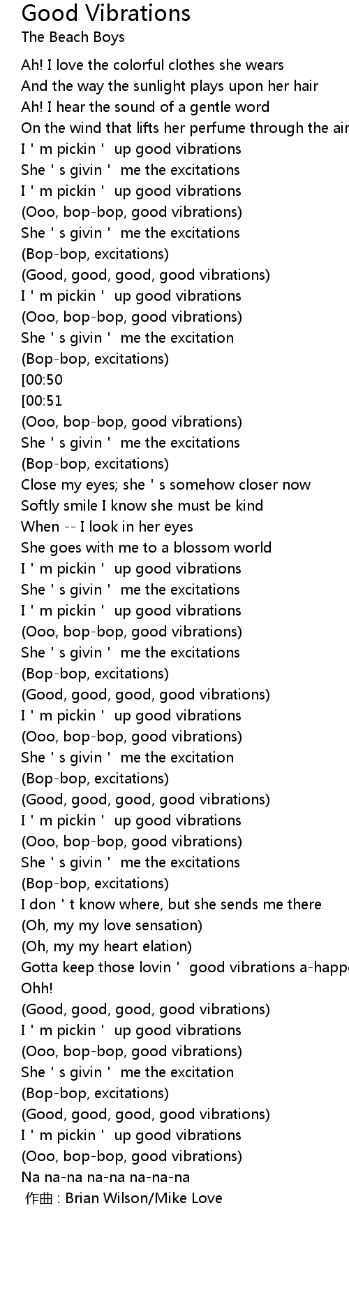 | [00:42][00:51] | I'm pickin' up good vibrations |