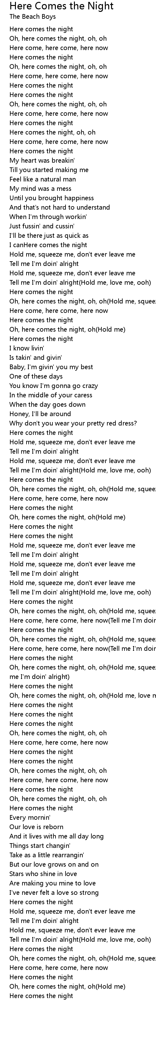 Oh, here comes the night, oh, oh(Hold me, squeeze me, don't ever leave me)(Tell me I'm doin' alright) |