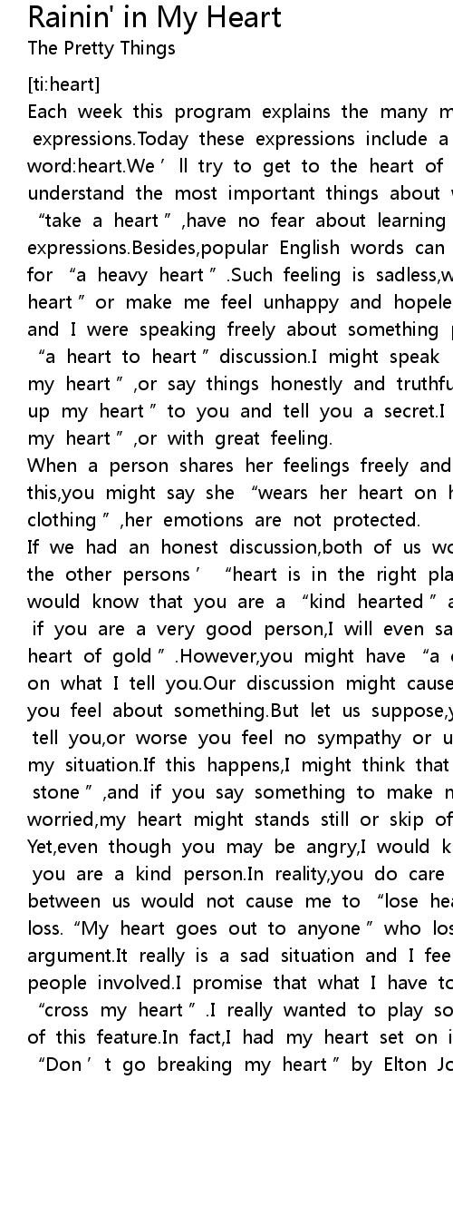 | [02:51.255] | Yet, even though you may be angry, I would know that at heart you are a kind person. In reality, you do care and any argument between us would not cause me to " lose heart " or feel a sense of loss." My heart goes out to anyone " who loses a friend over an argument. It really is a sad situation and I feel sympathy for the people involved. I promise that what I have told you today is true " cross my heart ". I really wanted to play some music at the end of this feature. In fact, I had my heart set on it, though here it is " Don ' t go breaking my heart " by Elton John. |