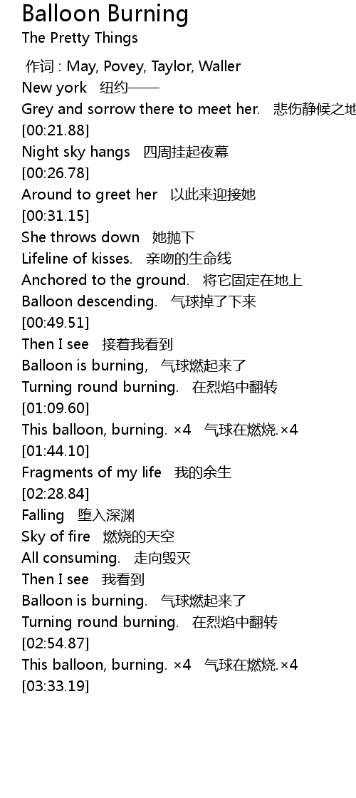 | [03:07.80] | This balloon, burning. ×4 气球在燃烧.×4 |