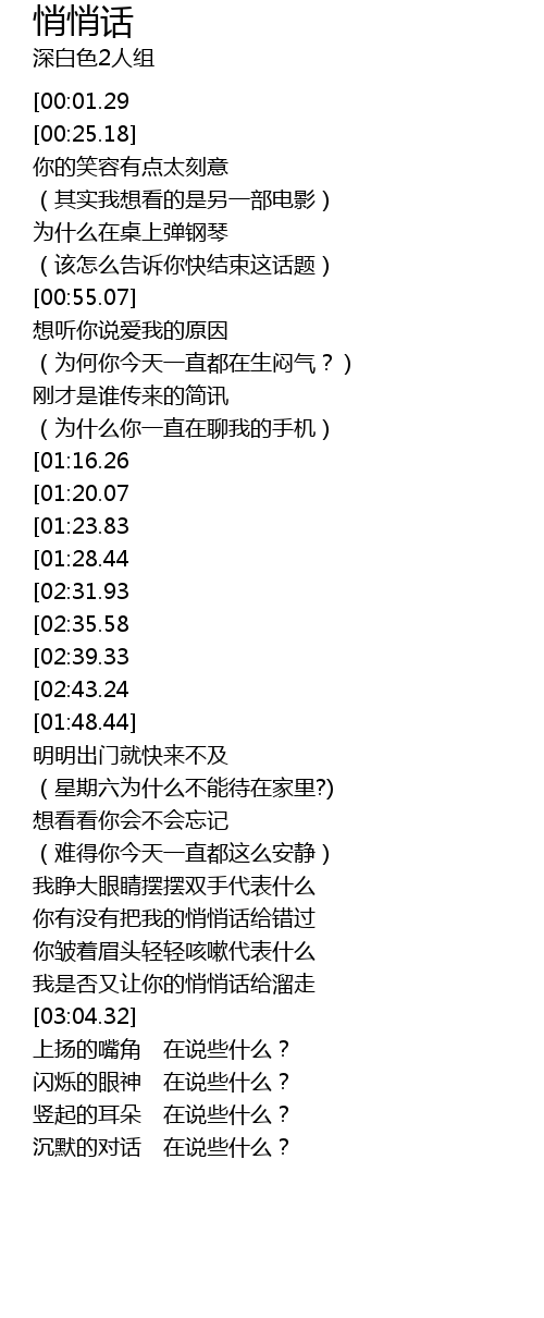 | [01:56.84][00:01.29] | 2.悄悄话 |