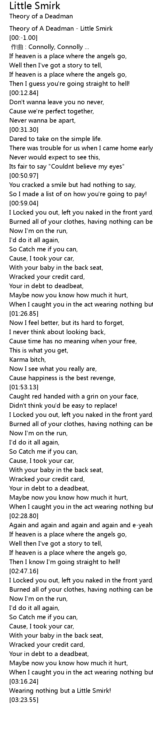 | [03:11.00] | When I caught you in the act wearing nothing but a Little Smirk! |