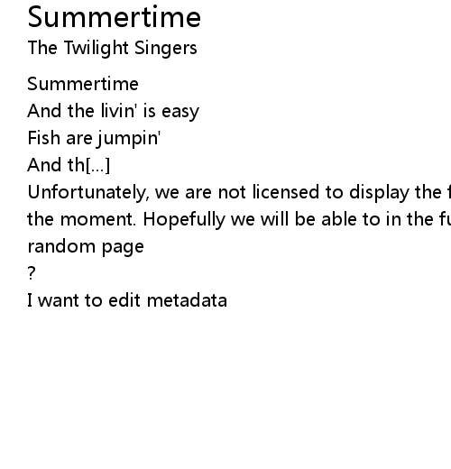 | Unfortunately, we are not licensed to display the full lyrics for this song at the moment. Hopefully we will be able to in the future. Until then, how about a | |