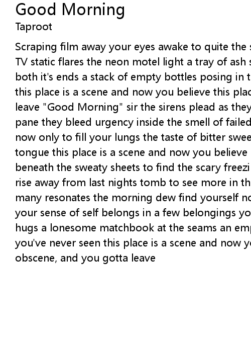TV static flares the neon motel light a tray of ash so full a candle burns at both it's ends a stack of empty bottles posing in the corner as your friends this place is a scene and now you believe this place is obscene, and you gotta leave "Good Morning" sir the sirens plead as they go laughing by through the pane they bleed urgency inside the smell of failed attempts and bad decisions now only to fill your lungs the taste of bitter sweet guilt now resides on your tongue this place is a scene and now you believe dig your bearings up from beneath the sweaty sheets to find the scary freezing holy carpet at your feet rise away from last nights tomb to see more in the view the resting place of many resonates the morning dew find yourself now reaching out for what is real your sense of self belongs in a few belongings you can feel a broken necklace hugs a lonesome matchbook at the seams an empty wallet shows a picture that you've never seen this place is a scene and now you believe this place is obscene, and you gotta leave |