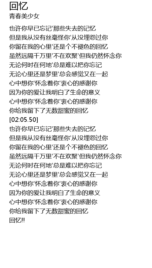 | [04:06.50] | 你给我留下了无数甜蜜的回忆 |