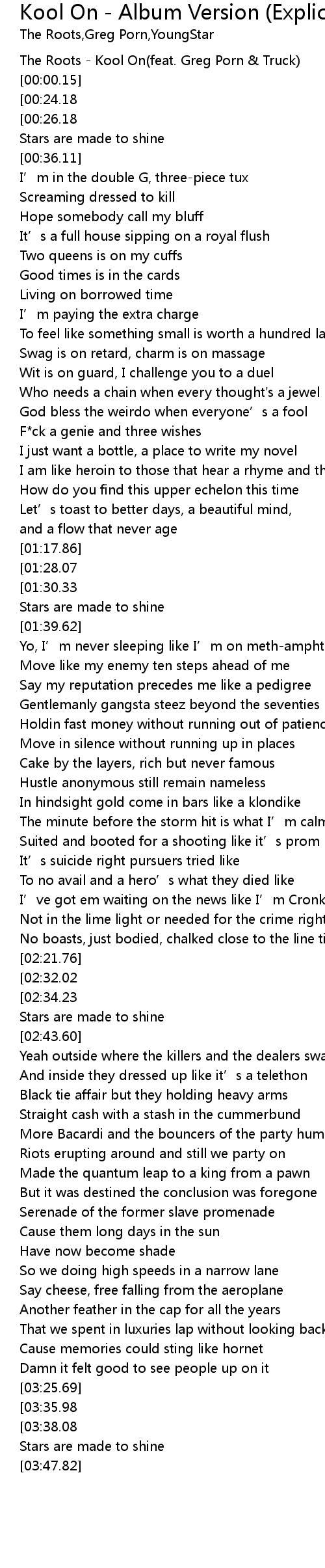 | [00:00.00] | The Roots - Kool On(feat. Greg Porn & Truck) |