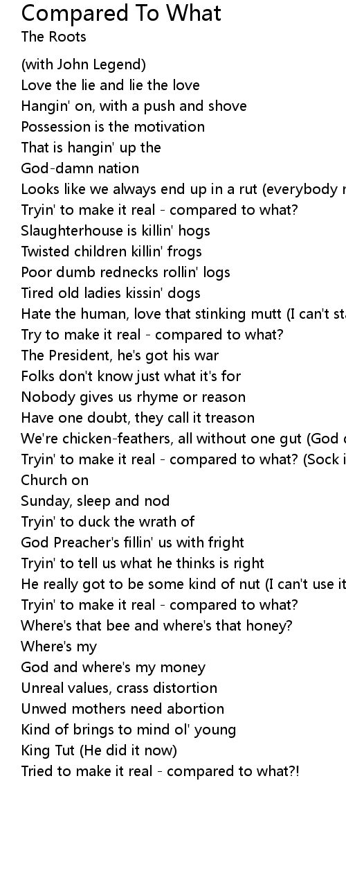 | Tryin' to make it real - compared to what? (Sock it to me, now) | |