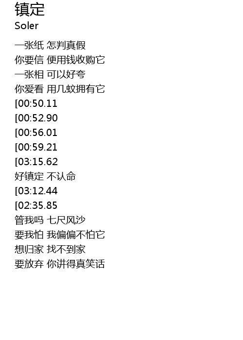 | [03:28.12][03:15.62][03:03.29][02:27.50][02:15.02][01:14.27][01:02.41] | bú huì tíng hǎo zhèn dìng bù rèn mìng |