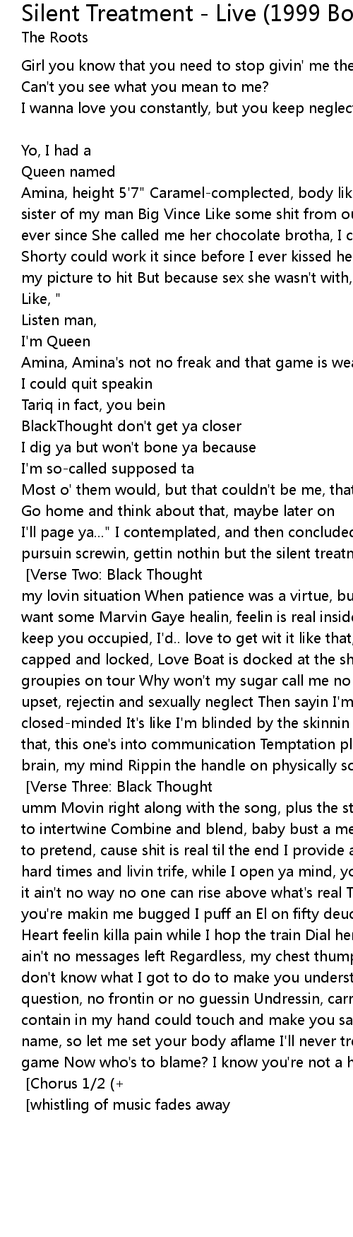 Silently bay-bee" at end)] [Verse Two: Black Thought] Crazy frustration, about my lovin situation When patience was a virtue, but I wasn't used to waitin I want some Marvin Gaye healin, feelin is real inside I slip and slide, my ride'll keep you occupied, I'd.. love to get wit it like that, but my baby's kitty cat's capped and locked, Love Boat is docked at the shore And what for? Later for groupies on tour Why won't my sugar call me no more? I mean, my Queen gets upset, rejectin and sexually neglect Then sayin I'm more sewer than Das EFX, and closed-minded It's like I'm blinded by the skinnin I'm into women; because of that, this one's into communication Temptation played the vandal, freakin my brain, my mind Rippin the handle on physically scandalous acts Yo! She knew what I wanted, but she fronted ... bust it [Chorus] [Verse Three: Black Thought] Well umm Movin right along with the song, plus the strong feelings on my mind, desire to intertwine Combine and blend, baby bust a message that I send Ain't no need to pretend, cause shit is real til the end I provide a place to hide from crime, hard times and livin trife, while I open ya mind, you're in my life like love, it ain't no way no one can rise above what's real That's why I'm feelin like you're makin me bugged I puff an El on fifty deuce while I walk in the rain Heart feelin killa pain while I hop the train Dial her number to the rest, and ain't no messages left Regardless, my chest thumps from stress, yo it's a mess I don't know what I got to do to make you understand I'm for real and that's no question, no frontin or no guessin Undressin, carressin, in the span, that I contain in my hand could touch and make you say that I'm such a man and call my name, so let me set your body aflame I'll never treat you like a dame or run game Now who's to blame? I know you're not a hoe for niggaz with a lot of dough But I just wanted you to know [Chorus (+ "silently" at end)] [Chorus 1/2 (+ "silently, si-lent-ly" at end)] [whistling of music fades away] |