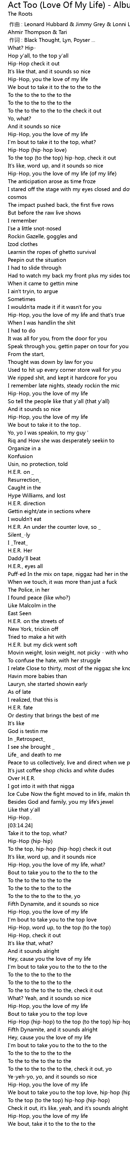 | [00:01.00] | 作词 : Black Thought, Lyn, Poyser ... |