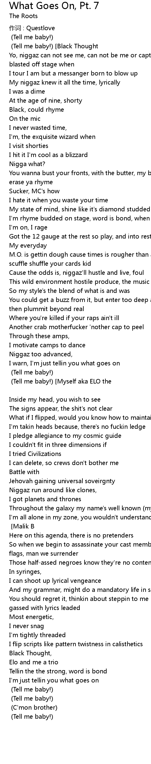 | [2X] (Tell me baby!) [Black Thought] | Do you wanna know.. what goes on? |