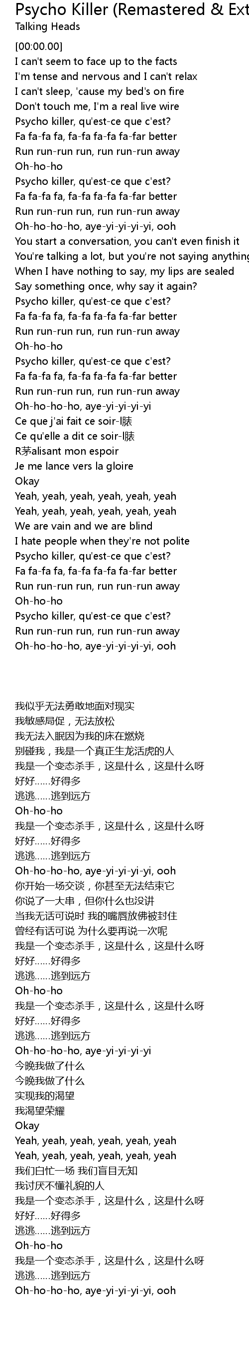 | [02:43.66] | Psycho killer, qu' estce que c' est? |