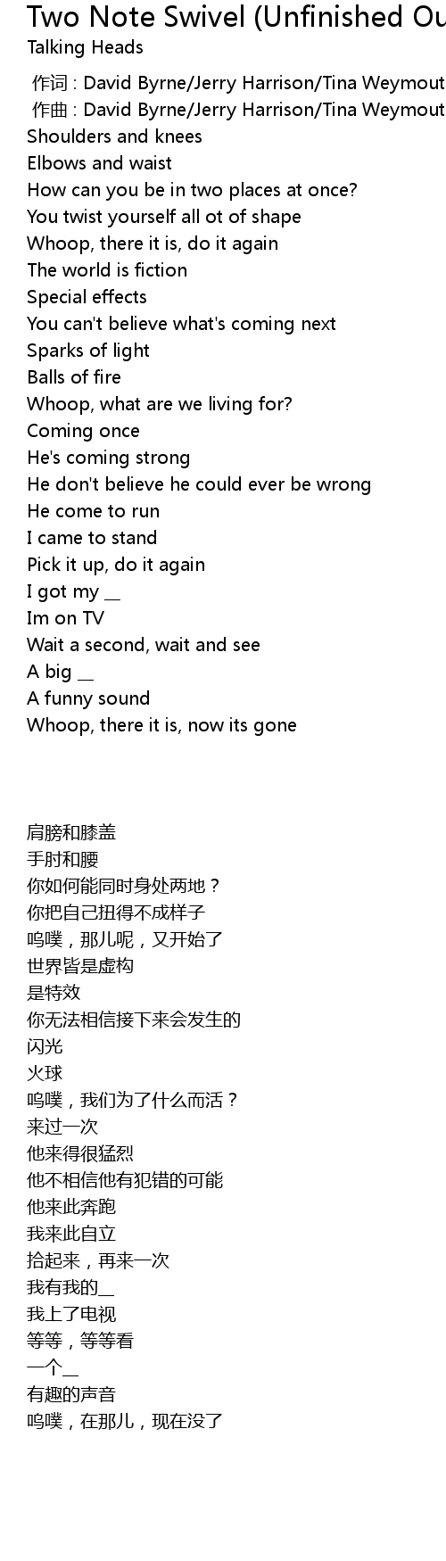 | [00:00.000] | zuo ci : David Byrne Jerry Harrison Tina Weymouth Chris Frantz |