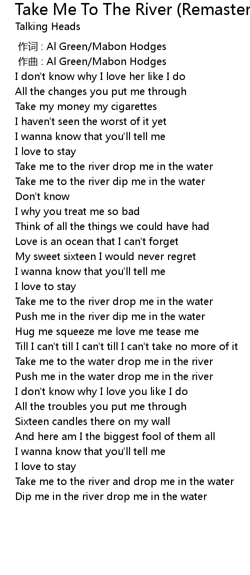 | [01:19.440] | Take me to the river dip me in the water |