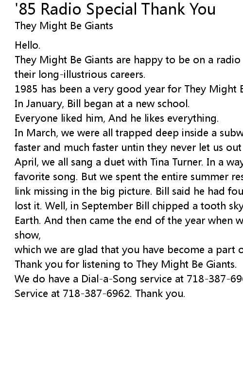 In March, we were all trapped deep inside a subway car racing down tracks going faster and much faster untin they never let us out a full ten blocks later. In April, we all sang a duet with Tina Turner. In a way it was nice, and it was our favorite song. But we spent the entire summer resting up, looking for some vital link missing in the big picture. Bill said he had found it, but in fact he had lost it. Well, in September Bill chipped a tooth skyriding far above the Planet Earth. And then came the end of the year when we were on our very last radio show, |
